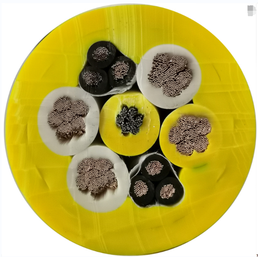 護套:PUR聚氨酯彈性體復(fù)合料(雙護套); 加強件:芯線中添加高強度柔性抗拉元件;抗扭層:雙護套中間有抗扭層(抗拉芳綸編織); 結(jié)構(gòu):擠壓式結(jié)構(gòu)成纜